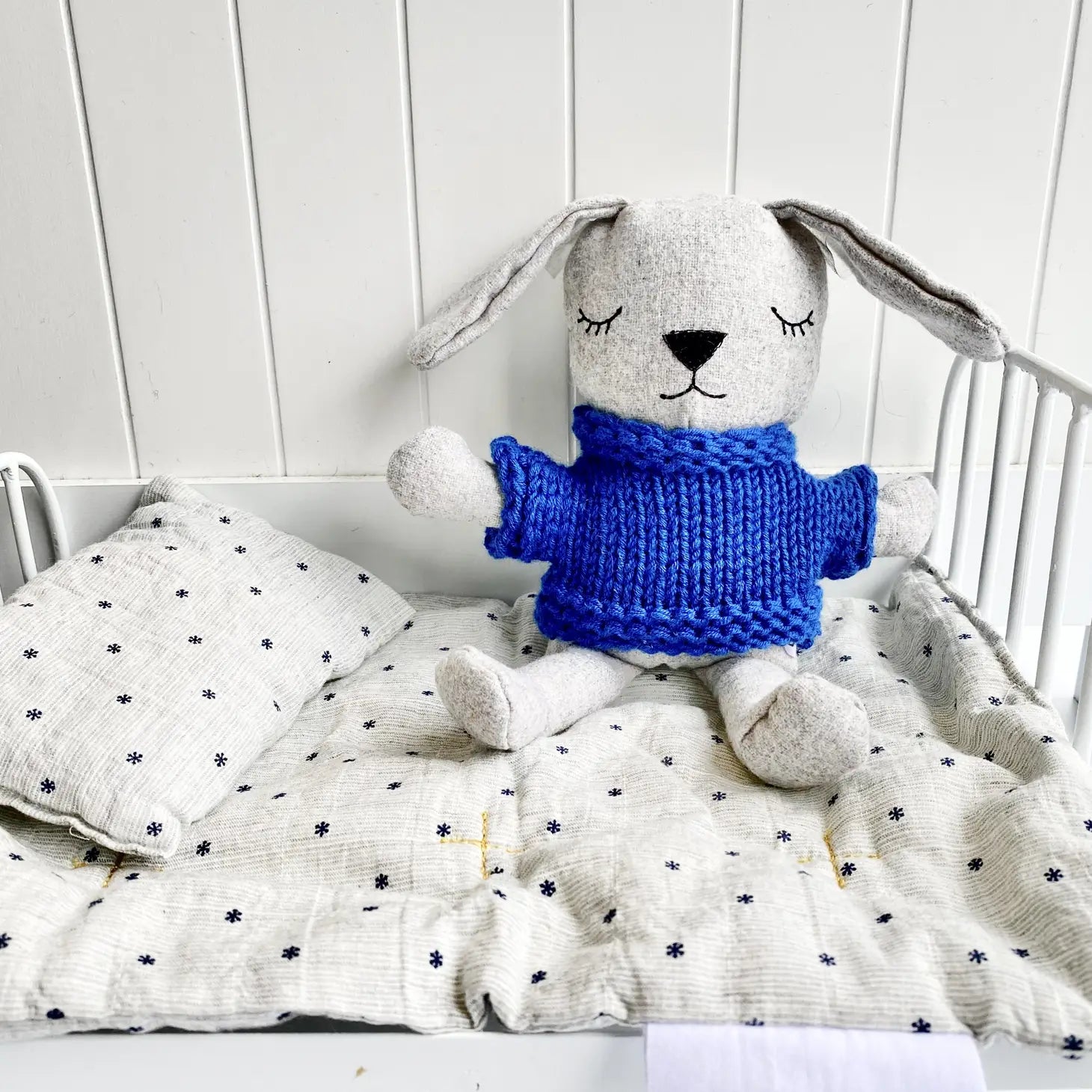 Albert the dog wears a persian blue knitted jumper made from Australian merino wool