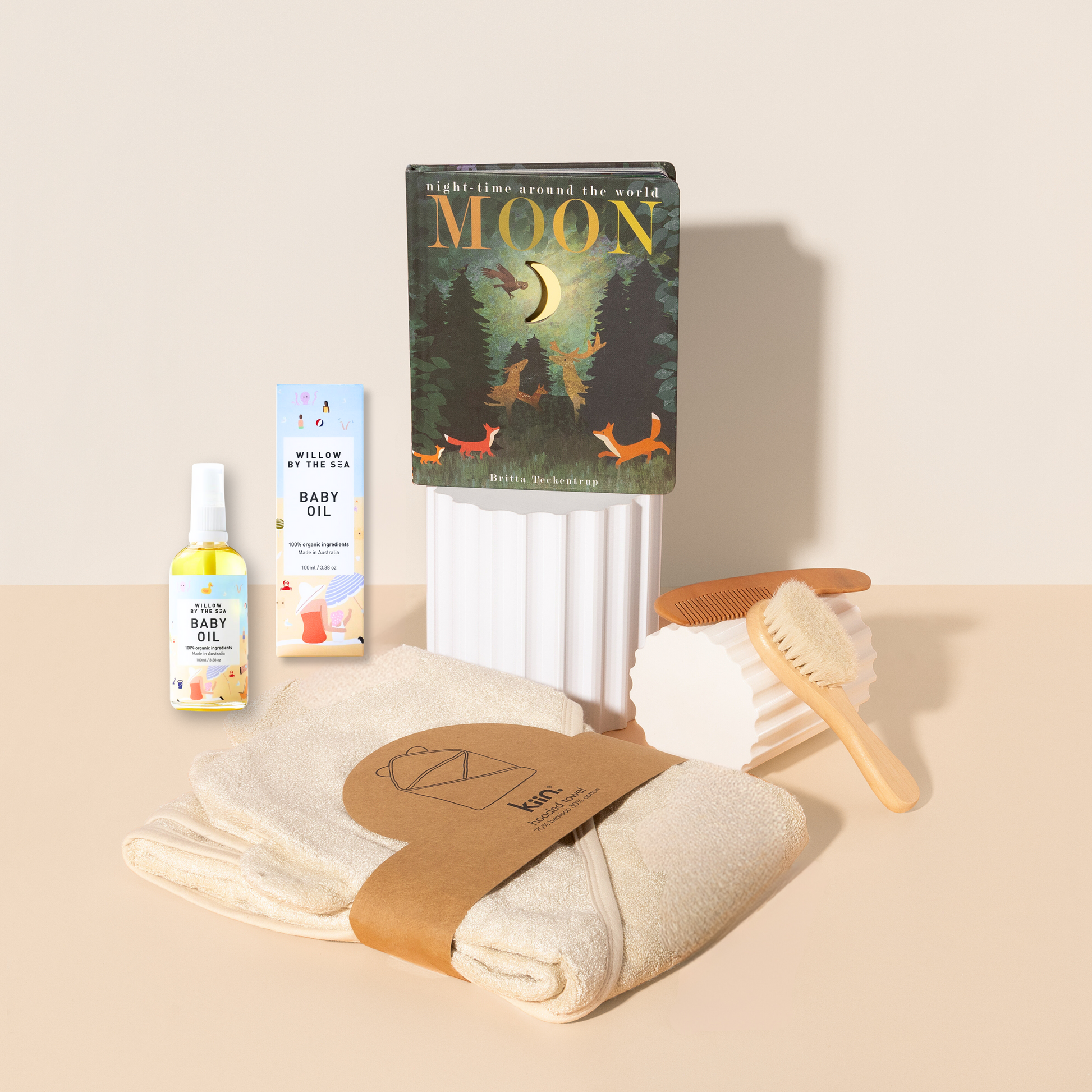 A wonderful gift set to add to baby's bedtime routine. It includes a luxuriously soft cotton towel with super cute bear ears to wrap baby around after a relaxing bath, a baby brush set designed to be gentle on baby's crown but gives them a delicate massage too. What a life! Also included is a lovely book titled Moon to ease into the night and of course Nappy cream to soothe and heal irritated and delicate skin. Its a gift that will be cherished and appreciated especially if it means a few more hours of sleep for the parent/s . Curated to be gender neutral, it makes a perfect gift for a surprise baby shower.