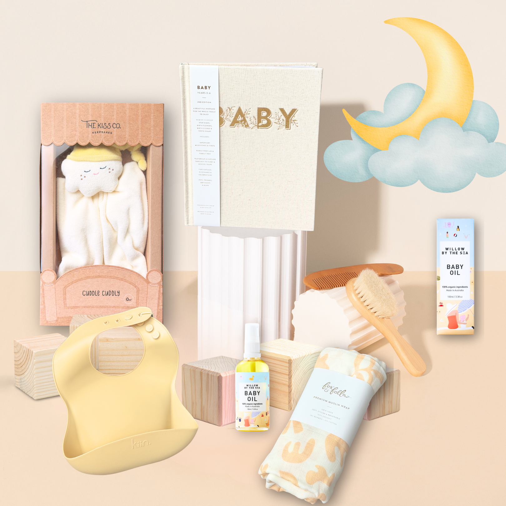 A wonderful gift set to add to baby's bedtime routine. It includes a luxuriously soft muslin swaddle and a baby brush set designed to be gentle on baby's crown but gives them a delicate massage too. Also included is silicone bib for those messy meals , a lovely baby book for new parents to document all those little milestones and baby oil to ease Bub into the night. It is a gift that will be cherished and appreciated especially if it means a few more hours of sleep for the parent/s .