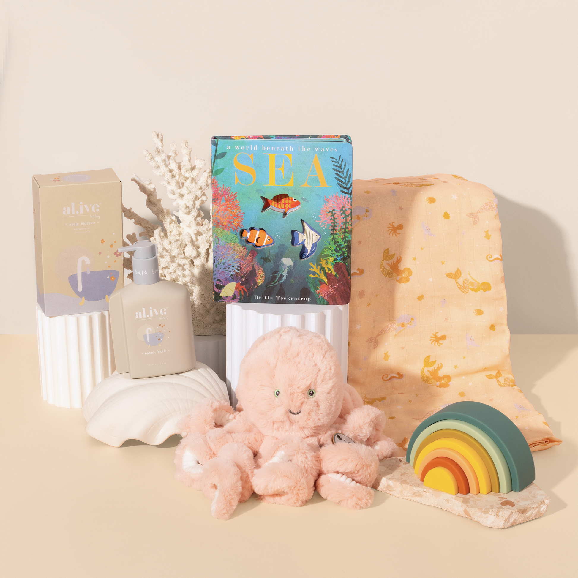 An adorable baby girl gift box perfect for a baby shower or when congratulations are in order. Welcome to the world the next little mermaid .